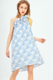 Летний сарафан из поплина с открытыми плечами длиной 77,0 см и одной бретелькой-завязкой с левой стороны. Перед и спинка на резинке выше линии груди. По переду ассиметричная рюша со сборкой. В боковых швах обработаны карманы. Сарафан на подкладке.