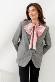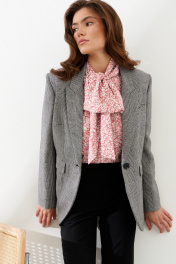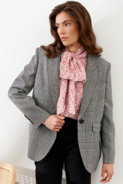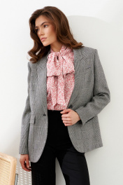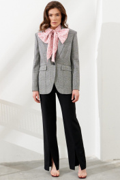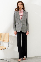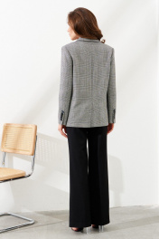 Жакет из шерсти в клетку длиной 70 см. Рукав втачной длиной 62 см со шлицами. По переду прорезные карманы с клапанами. Застежка центральная на петлю и пуговицу. Воротник пиджачный, спинка со средним швом и шлицей. Жакет на подкладке