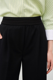 - ОписаниеБрюки длиной по боковому шву 104 см (от шва притачивания пояса), по шаговому шву 83 см. Ширина брюк по низу 25 см. Передние половинки брюк с односторонними складками и наклонными карманами. Декоративный эластичный пояс. Имитация карманов с листочками по заднему полотнищу брюк. Имитация застежки-гульфик.
