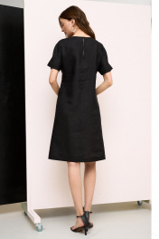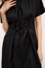 Женское платье свободного кроя со спущенным плечом, длиной 97 см (для 42 р-ра). Перед дополнен шнуровкой, позволяющей регулировать объем платья. Длина рукава от горловины составляет 27 см (для 42 р-ра). На спинке изделия разрез, застегивающийся на пуговицу.