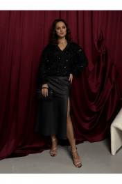 Это юбка А-образного силуэта, покроенная по косой, что придает ей особую мягкость и плавность линий. Модель без подкладки, что делает ее легкой и комфортной для носки. Длина юбки — миди, она достигает середины икры, создавая элегантный и универсальный образ. Верхний срез обработан изящной атласной тесьмой, которая придает изделию аккуратный и стильный вид. Застежка выполнена в виде потайной молнии, расположенной в боковом шве, что обеспечивает гладкую поверхность и удобство при надевании. Переднее полотнище украшено разрезом, добавляющим образу нотки изящества и немного дерзости. Эта юбка отлично подойдет для создания как повседневных, так и более торжественных образов, подчеркивая женственность и стиль.