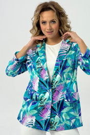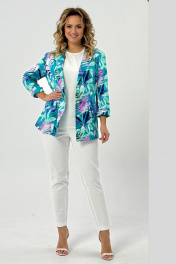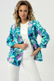 Двубортный жакет полуприлегающего силуэта, ткань хлопок. По переду обработаны прорезные карманы с листочкой и клапанами. Отложной воротник с лацканами. Рукав втачной длинный с подворотом. Спинка жакета со шлицой. Жакет без подкладки. Украшением данной модели являются стильные пуговицы. Длина жакета по спинке 70см., длина рукава 52см.