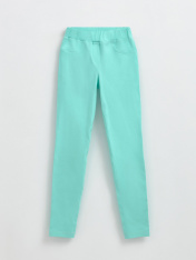 Леггинсы женские, облегающие из однотонного трикотажного полотна. По переду имитация гульфика и боковых карманов. По спинке кокетки и накладные карманы. Верх изделия обработан поясом с эластичной тесьмой внутри. По правому переднему шву нашиты аппликации в виде бабочек.