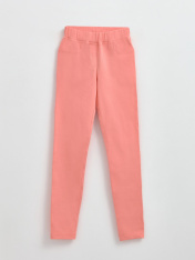 Леггинсы женские, облегающие из однотонного трикотажного полотна. По переду имитация гульфика и боковых карманов. По спинке кокетки и накладные карманы. Верх изделия обработан поясом с эластичной тесьмой внутри. По правому переднему шву нашиты аппликации в виде бабочек.