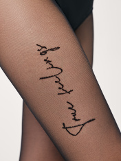 Тонкие эластичные фантазийные женские колготки 30 ден с рисунком "имитация тату" в виде надписи черной полиамидной нитью в области щиколотки и бедра, рисунок расположен на одной ноге, двойной оплет нити, плоский шов, хлопковая ластовица, укрепленный мысок.