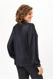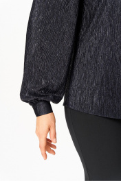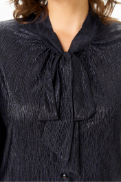 Блузка женская прямого силуэта, с центральной застежкой по переду на петли и пуговицы. По горловине переда-легкая сборка, воротник стойка, переходящая в бант. Рукав длинный, со сборкой по окату и по низу, заканчивающейся манжетой, с застежкой на петлю и пуговицу. Длина изделия-67 см, длина рукава-66 см