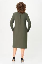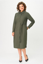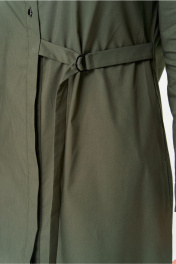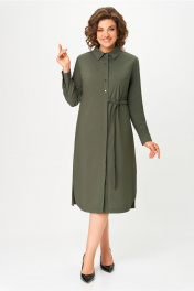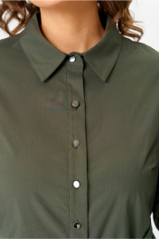 Платье рубашка прямого силуэта с отложным воротником на стойке. По переду – нагрудные выточки, карманы в боковых швах. Застежка в виде планки на декоративных пуговицах-до талии и потайные пуговицы-ниже талии. Ассиметричная деталь-пояс на полукольцах. Фигурные разрезы в боковых швах. По спинке фигурная кокетка, центральный шов со встречной складкой в верху. Рукав в точной 1-шовный, длинный с застёжкой на планку спереди, со складкой по низу и манжетой. Длина изделия 117 см.
