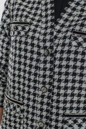 Жакет женский прямого силуэта , выполненный из ткани "Шанель" высокого качества . Жакет с центральной застежкой , рукав втачной , линия плеча спущена . По переду жакета также функциональные накладные карманы и отделочные паты. В качестведекора отделочная тесьма по краю карманов и акцентные пуговицы.