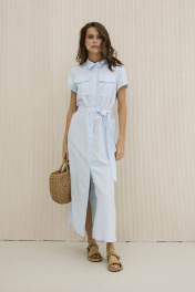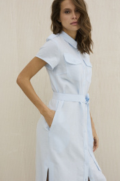 Платье женское, прямого силуэта. Выполнено из льняной ткани, в состав которой входит вискоза , что придает мягкость на ощупь . Платье распашное с центральной застежкой в виде планки на петли и пуговицы . Горловина оформлена воротником рубашечного типа. Рукав втачной короткий с плавной окантованной линией низа. По переду платья нагрудные карманы с клапанами . По боковым швам функциональные карманы и разрезы с закрытыми срезами. В комплекте съемный пояс из основной ткани.