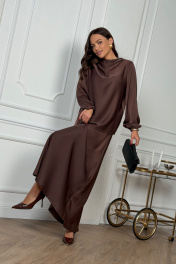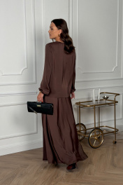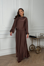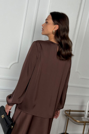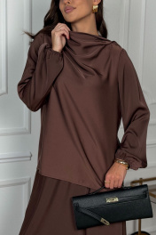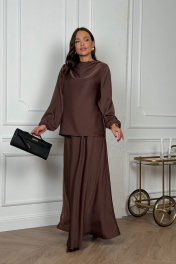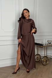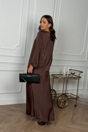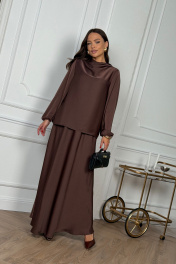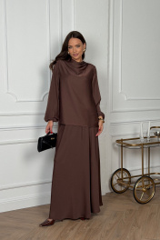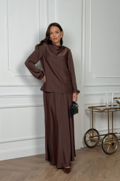 Комплект женский полуприлегающего силуэта , выполненный из исусственного шелка . Горловина в виде драпировки , рукав втачной одношовный со сборкой внизу рукава . В верхней части спинки разрез с пуговицей. Юбка женская , свободного силуэта выкроена по косой . Верхний край юбки обработан эластичной тесьмой (резинкой) с закрытым срезом .