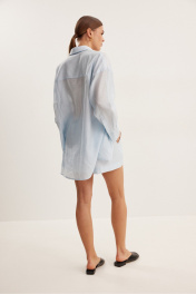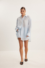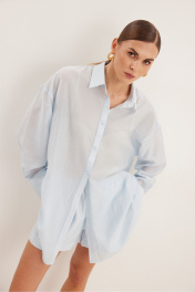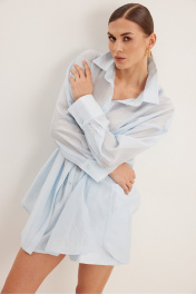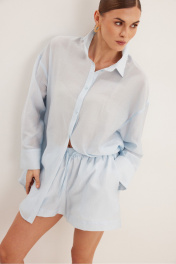 Комплект , состоящий из блузки и шорт свободного силуэта . Выполнен из полупрозрачной вуали . Воротник рубашечного типа , застежка центральная в виде планки на петли и пуговицы . Линия плеча спущена .Рукав с притачной манжетой и шлицей . Шорты свободного силуэта с функциональными карманами и хлопковой подкладкой . Верх шорт обработан притачным поясом с резинкой .