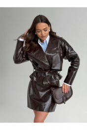 Жакет приталенного силуэта , выполнен из искусственной кожи . Жакет на подкладке . Воротник стояче-отложной с отворотами лацканов . Рукав покроя реглан , по переду и спинке отлетная кокетка . Приталивание достигается за счет съемного пояса с пряжкой .