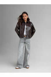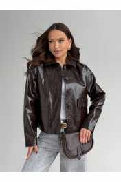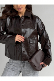Жакет полуприлегающего силуэта , выполнен из искусственной кожи . Жакет на подкладке .Воротник стояче-отложной . По переду застежка центральная потайная и накладные карманы с клапанами . Рукав слегка спущенный .