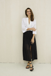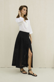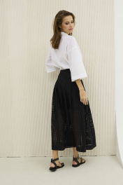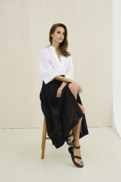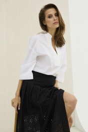 Блуза свободного силуэта со спущенной линией плеча и рукавом длиной 3/4. Вырез блузы и аккуратная стойка офрмлены планками из ришелье , основная ткань тонкий 100% хлопок .