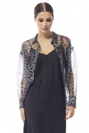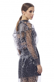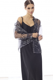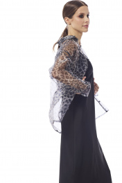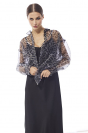 Блуза женская , выполнена из принтованной органзы .Рукав втачной одношовный с притачной манжетой. Воротник рубашечный , застежка центральная на петли и пуговицы .