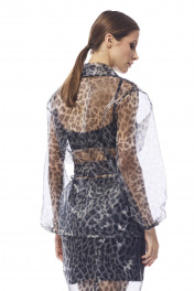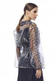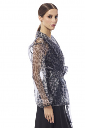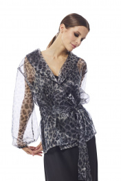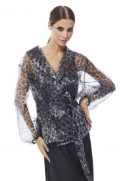 Блуза женская приталенного силуэта на запах , выполнена из принтованной органзы . Рукав втачной одношовный , эластичная тесьма в нижней части рукава . Воротник в виде шали . В области талии блуза фиксируется съемным поясом.