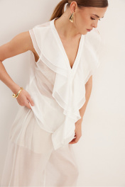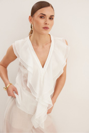 Блузка из вискозной вуали , полуприлегающего силуэта . Вырез Y- образной формы . По переду декор в виде двухслойного волана .