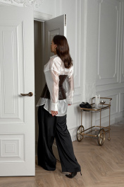 Брюки свободного силуэта со складками и карманами вверху, сзади брюк также функциональный карман с клапаном . Верх брюк обработан подкройным поясом .