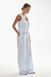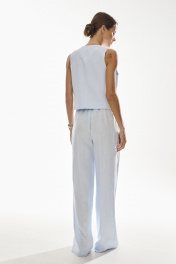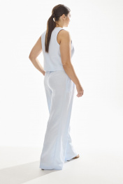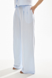 Брюки свободного силуэта . Выполнены из качественного смесового льна . Верх брюк обработан притачным поясом с резинкой , застежка в виде молнии , по переду брюк функциональные боковые карманы и складки .
