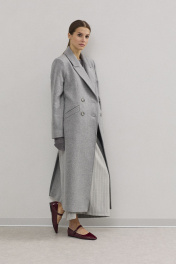 Пальто женское двубортное , выполнено из пальтовой ткани великолепного качества . Рукав втачной двухшовный , воротник стояче-отложной с отворотами лацканов. По переду прорезные карманы.Сзади по среднему шву - шлица.