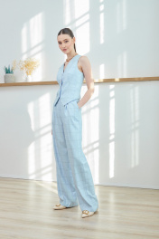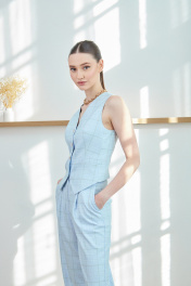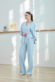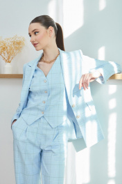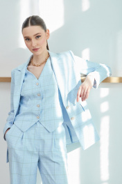 Костюм женский из ткани костюмно-плательного ассортимента, с дизайном клетка, состоящий из жакета и брюк. Жакет полуприлегающего силуэта, длиной до линии бёдер, с втачными двухшовными рукавами длиной до запястья, с воротником пиджачного типа, с отложными лацканами с острыми концами, застёжка центральная на две петли и пуговицы. Детали переда с талиевыми вытачками, переходящими в линию кармана и рельефами от проймы до низа, карманы прорезные «в рамку», с клапанами со скруглёнными концами. Спинка с рельефами от пройм до низа, со шлицей в среднем шве. В локтевых швах обработаны функциональные шлицы с застёжкой на три петли и пуговицы. Нижние края бортов прямоугольные. Жакет на подкладке. Брюки с посадкой на талии, прямые от бедра, длиной ниже щиколотки. Передние половинки со складкой по центру, с карманами, наклонными к боковым швам. В среднем шве застёжка на тесьму-молнию. Задние половинки с талиевыми вытачками и нефункциональными карманами с листочкой. Пояс обтачной с застёжкой на петлю и пуговицу, с пятью шлёвками для съёмного пояса. По передним и задним половинкам заутюжены стрелки.