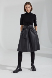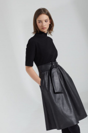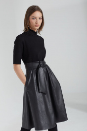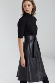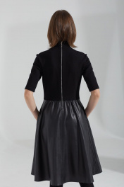 Платье отрезное по талии, состоящее из двух видов материала, верхняя часть прилегающего силуэта из трикотажного полотна, нижняя часть А-силуэта из эко кожи. Платье длиной до колена. Воротник стойка, прилегающая к горловине. Детали переда с нагрудными вытачками, спинка с декоративной металлической молнией в среднем шве и талиевыми вытачками. Нижняя часть с боковыми и средним швом по переду и спинке, с отделочными строчками по обе стороны относительно швов. Рукава втачные длиной до локтя. Платье без подкладки.
