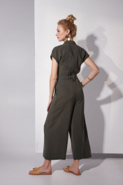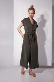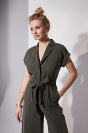 Комбинезон из вискозной ткани платьево-блузочного ассортимента, длиной выше щиколотки, свободного кроя с цельнокроёными рукавами, с воротником и лацканами пиджачного типа, с потайной застёжкой на петли и пуговицы. Передние половинки с рельефами от плечевых швов до низа, с накладными, прямоугольными карманами на уровне груди. Спинка отрезная по талии, с отрезной кокеткой и средним швом нижняя часть комбинезона - брюки прямого силуэта, с карманами в боковых швах. На тали, по центру спинки и по центру рельефов переда расположены широкие шлёвки для съёмного пояса, которые закреплены в нижнем углу петлёй и пуговицей. Пояс из основной ткани завязывается на бант. Низ рукавов обтачной с широкой отделочной строчкой. По воротнику, лацканам, рельефам, карманам, кокетке, среднему шву спинки, шлёвкам, поясу, прострочена отделочная строчка.