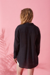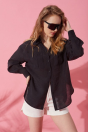 Блузка из лёгкой вискозной ткани платьево-блузочного ассортимента, прямого силуэта, свободного кроя «оверсайз», длиной ниже линии бёдер, со спущенным плечевым швом, с рубашечными рукавами. Горловина округлой формы, с рубашечным воротником. Застёжка на петли и пуговицы на цельнокроёной планке. Детали переда с накладными карманами прямоугольной формы. Карманы с бантовой складкой по центру и отрезной планкой по верхнему краю. Спинка с бантовой складкой из шва притачивания кокетки. Низ блузки с высокими скруглёнными разрезами по боковым швам. Рукава с двумя парами складок по шву притачивания манжет и притачными планками по разрезу рукавов. Застёжка манжет на две пары петель и пуговиц.