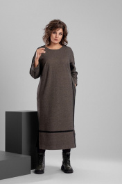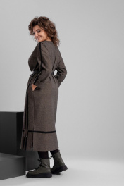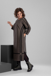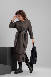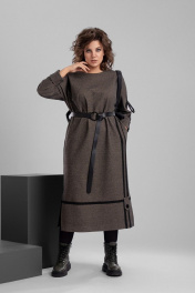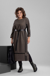 Платье женское прямого силуэта из теплого трикотажного полотна. Вырез горловины неглубокий округлой формы. Рукав отрезной на базе цельнокроеного с манжетом. В боковых швах функциональные карманы, по боковым швам - разрезы. По рукавам, переду и спинке декоративные вставки черного цвета, по переду также декоративная пата с пуговицей. Изделие дополнено съемным поясом.