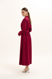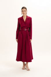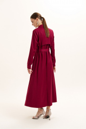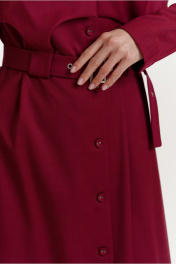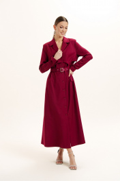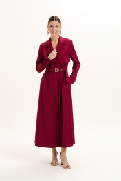 Платье женское А - силуэта из костюмной ткани. Вырез горловины оформлен воротником пиджачного типа с застежкой на петли с пуговицами. Рукава - втачные. В боковых швах выполнены карманы. Спереди и сзади изделие декорировано кокетками сложной архитектурной формы. При помощи пояса из основной ткани возможно создать приталенный силуэт.