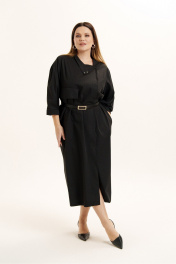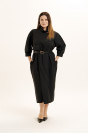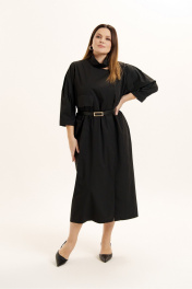 Платье женское свободного покроя из легкой хлопковой ткани. Вырез горловины оформлен воротником стойкой, застежка смещена, на петли -пуговицы и частично кнопки. На правой полочке объемный накладной карман и клапан. В боковых швах расположены функциональные карманы. Рукава слегка спущенные с мягкими складками по окату и по низу, манжет отрезной. Изделие дополнено съемным поясом.