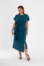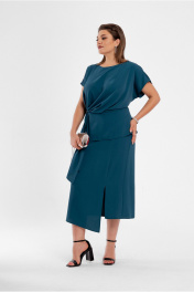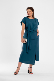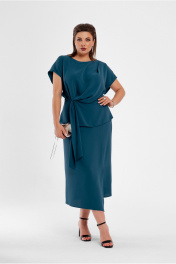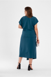 Комплект женский двухпредметный. Блуза полуприлегающего силуэта, перед на подкладке. Вырез неглубокий округлой формы. Рукав короткий цельнокроеный. По спинке застежка на молнию. Перед отрезной по талии, вверху асимметричные декоративные складки, по низу баска. Юбка с обтачкой на подкладке. Застежка на потайную молнию. По переду разрез в рельефе. Низ асимметричный.