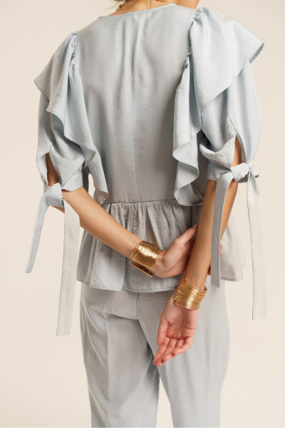 Комплект женский двухпредметный из вискозной ткани. Блузка свободного покроя с воланом по линии талии. Вырез горловины V-образный со шнуровкой из основной ткани. Рукава втачные объемной формы. Низа рукавов оформлены отрезными манжетами, переходящими в завязки. В вертикальные подрезы вставлены воланы с легкой сборкой. Длина спинки от линии горловины - 60 см., длина рукава от линии горловины - 47 см. Брюки свободного покроя из легкой вискозной ткани. Пояс с эластичной тесьмой и шнурком из основной ткани для регулировки обхвата талии. В боковых швах имеются карманы с отрезными бочками. Длина брюк по боковому шву с поясом - 115 см.
