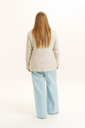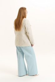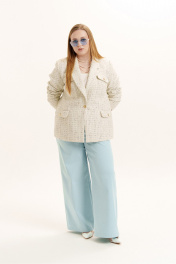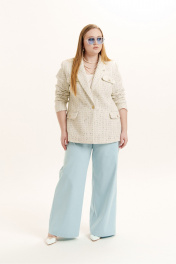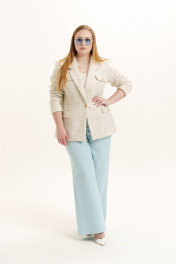 Костюм женский двухпредметный выполнен из ткани двух видов (твид и джинс). Жакет прямого силуэта на подкладке. Вырез горловины оформлен воротником пиджачного типа с застежкой на петли и пуговицы. Рукава - втачные двухшовные с плечевыми накладками. На полочке обработаны прорезные карманы с клапанами и отделочный элемент в виде клапанов. Изделие декорировано золотыми пуговицами. Брюки - прямые. Пояс - отрезной с застежкой на молнию и петлю с пуговицей и частично на резинке. Имеются карманы с отрезными бочками и шлевки для ремня. На заднем полотнище обработаны кокетки и накладные карманы. Отделочная фурнитура может меняться.
