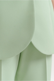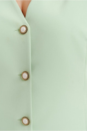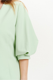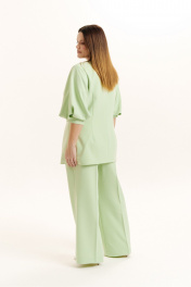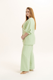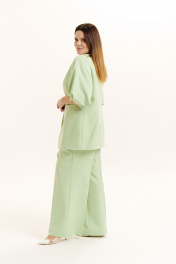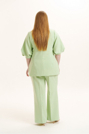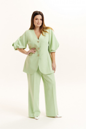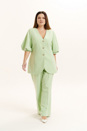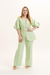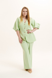 Костюм женский двухпредметный, жакет на подкладке. Жакет приталенного силуэта, с V-образной горловиной и рукавом фонариком на мажете. Жакет декорирован пуговицами. Брюки - прямые. Пояс - отрезной с застежкой на молнию и петлю с пуговицей и частично на резинке. Имеются карманы с отрезными бочками и шлевки для ремня. Низ брюк обработан закрытым швом. Отделочная фурнитура может меняться.