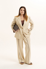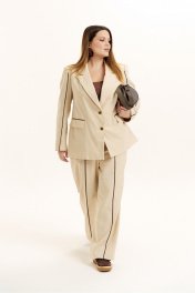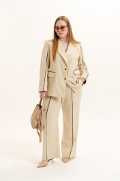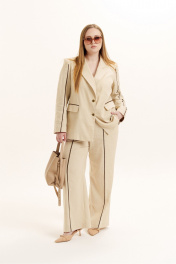 Костюм женский двухпредметный из натуральной ткани премиум класса. Жакет на подкладке, прямого силуэта, вырез горловины оформлен воротником пиджачного типа с застежкой на петли и пуговицы. По переду изделия обработаны прорезные карманы в рамку с клапаном. Изделие декорировано контрастным кантом по рукаву, карманам и передним полотнищем брюк. Брюки - прямые. Пояс - отрезной, на резинке по кругу. Имеются карманы с отрезными бочками и шлевки для ремня. Низ брюк обработан швом в подгибку с закрытым срезом. Отделочная фурнитура может меняться.