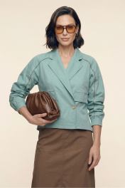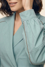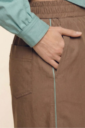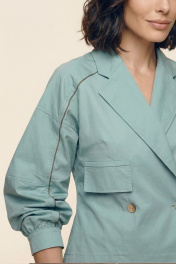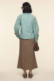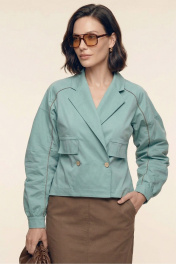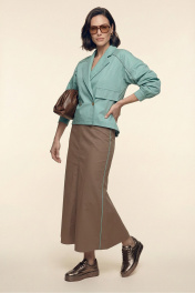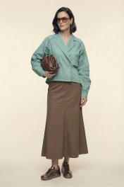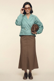 Комплект женский двухпредметный из хлопковой ткани. Блузка с объемными рукавами сложной архитектурной формы. Вырез горловины оформлен воротником пиджачного типа. Застёжка – двубортная на петли с пуговицами. Спереди выполнена имитация прорезных карманов с листочками. Низ изделия – асимметричной формы. Низа рукавов со сборкой, посажены на отрезные манжеты. В подрезы рукавов вставлены декоративные канты из основной ткани контрастного цвета. Юбка – А-силуэта из четырёх клиньев. Пояс – отрезной, частично с эластичной тесьмой. В боковых швах выполнены карманы. Изделия декорировано кантами из основной ткани контрастного цвета.