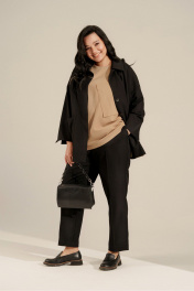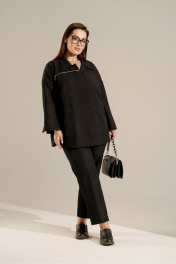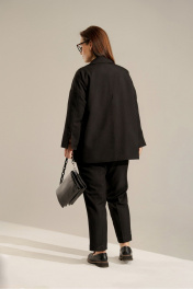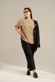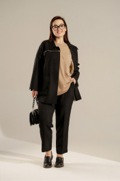 Комплект женский трехпредметный. Жакет прямой на подкладке с потайной застежкой на петли и пуговицы. Воротник пиджачного типа, рукав отрезной на базе цельнокроеного, по низу с разрезом. По переду декоративная молния, накладные карманы. Сзади высокая шлица. Длина по спинке - 72 см, длина рукава от горловины - 66 см. Брюки классические, в боковых швах карманы с отрезным бочком. Застежка на молнию и петлю с пуговицей. Пояс отрезной с вставкой эластичной тесьмы. Длина с учетом пояса - 98 см. Блуза трикотажная с коротким рукавом свободного покроя. Вырез горловины неглубокий округлой формы, сзади застежка на петлю и пуговицу. Спереди накладной декоративный накладной карман. Длина по спинке - 70 см, длина рукава от горловины - 47 см.