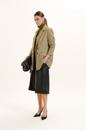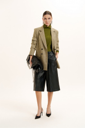 Комплект женский трехпредметный. Жакет классического покроя из поливискозной ткани. Вырез горловины оформлен воротником пиджачного типа с двубортной застежкой на петли с пуговицами. Рукава - втачные, двухшовные. Линия плеч усилена плечевыми накладками. Спереди имеются прорезные карманы, сзади - шлица. Изделие посажено на подкладку. Шорты-бермуды из искусственной кожи на хлопковой основе. Пояс - отрезной с эластичной тесьмой и застежкой на брючный крючок. В боковых швах - карманы с отрезными бочками. Изделие декорировано вертикальными подрезами с отделочными строчками. Есть шлевки для ремня. Джемпер женский полуприлегающего силуэта из трикотажного полотна. Вырез горловины - неглубокий, округлой формы. Рукава - втачные.