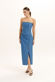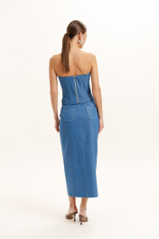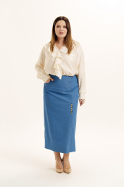 Юбка женская из джинсовой ткани без подкладки, длинны миди. На юбке обработаны карманы-хулиганы по переду и накладные карманы по спинке. На переднем полотнище юбки ассиметричная шлица декорирована кнопками. Пояс обработан закрытым срезом с застежкой на молнию и кнопку.