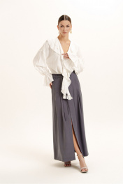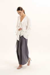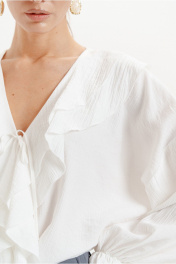 Блузка женская свободного силуэта из легкой плательной ткани. Вырез горловины V-образной формы с воланами. Застежка - завязки. Рукав а- втачные, объемной формы, присборенные внизу на эластичную тесьму.