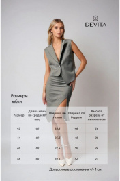 Стильная юбка-карандаш с ассиметричной линией низа из костюмной вискозной ткани премиум класса, с добавлением шерсти. Великолепно садится на фигуру, благодаря отточенным лекалам. Юбка на талии, прямого силуэта, длиной до линии колен, с обтачным поясом и ассиметричным разрезом по переду. Юбка на подкладке, притачной по низу. На заднем полотнище потайная молния в среднем шве. Прекрасно подойдёт для офисных аутфитов и нарядных историй. Статусная вещь с различными вариантами стилизации и комплектации с изделиями бренда DEVITA. К юбке идеально подходит жилет арт. 4014-1 из аналогичной ткани и цвета, для создания комплекта – двойки. Измерения готового изделия расположены в табличке с фотографиями.