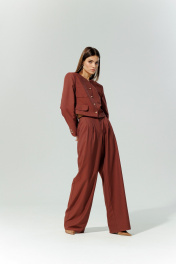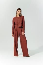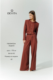 Брюки палаццо не только подчеркнут вашу женственность и элегантность, но и обеспечит комфорт во время длительной носки. Идеальная посадка брюк вытягивает силуэт. Брюки на талии, плотно облегающие вверху и расширенные от линии бёдер, с застёжкой по переду на тесьму молнию и один потайной крючок. Верхний край брюк обработан обтачкой. По переду брюк два кармана с отрезными бочками, по линии талии обработаны по две складочки на каждой половине. На задних частях брюк обработаны по одной вытачки на каждой половине и имитация кармана с листочкой. Брюки от бренда DEVITA визуально преображают фигуру владелицы, длина помогает обозначить талию и подчеркнуть длину ног. К брюкам мы рекомендуем жакет из аналогичной ткани и цвета арт.4013. С жакетом получится очень модный и стильный женский костюм-двойка в стиле old money. Измерения готового изделия расположены в табличке с фотографиями. Уход за изделием: Бережная стирка при максимальной температуре 30ºС, Не отбеливать, Машинная сушка запрещена, Глажение при максимальной температуре 110ºС без пара, Профессиональная сухая чистка - мягкий режим.