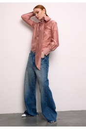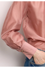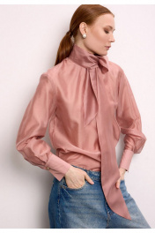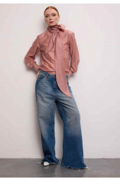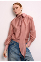 Элегантная блузка свободного кроя с выразительным воротником-стойкой на завязках. Задняя часть оформлена средним швом с декоративным разрезом в верхней части. Рукава классического рубашечного кроя дополнены аккуратными манжетами с застежкой на пуговицу, украшенные изящными односторонними складочками по линии шва. Все разрезы аккуратно обработаны бейкой, а скошенные концы завязок воротника подчеркивают внимание к деталям. Свободный силуэт обеспечивает комфорт, а продуманный крой создает элегантный силуэт. Идеальный вариант для тех, кто ценит сочетание удобства и стиля в повседневных и деловых образах.