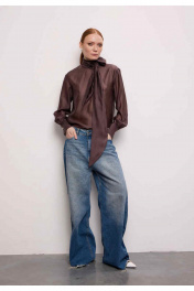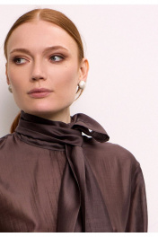 Элегантная блузка свободного кроя с выразительным воротником-стойкой на завязках. Задняя часть оформлена средним швом с декоративным разрезом в верхней части. Рукава классического рубашечного кроя дополнены аккуратными манжетами с застежкой на пуговицу, украшенные изящными односторонними складочками по линии шва. Все разрезы аккуратно обработаны бейкой, а скошенные концы завязок воротника подчеркивают внимание к деталям. Свободный силуэт обеспечивает комфорт, а продуманный крой создает элегантный силуэт. Идеальный вариант для тех, кто ценит сочетание удобства и стиля в повседневных и деловых образах.