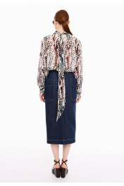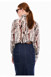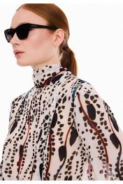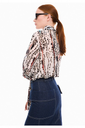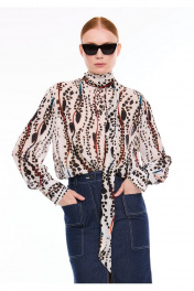 Элегантная блузка из итальянского принтованного вискозного шифона, свободного кроя, с выразительным воротником-стойкой на завязках. Задняя часть оформлена средним швом с декоративным разрезом в верхней части. Рукава классического рубашечного кроя дополнены аккуратными манжетами с застежкой на пуговицу, украшенные изящными односторонними складочками по линии шва. Все разрезы аккуратно обработаны бейкой, а скошенные концы завязок воротника подчеркивают внимание к деталям. Идеальный вариант для тех, кто ценит сочетание удобства и стиля в повседневных и деловых образах. Изысканный принт блузки привнесет в гардероб нотку шика. Измерения готового изделия расположены в табличке с фотографиями.