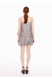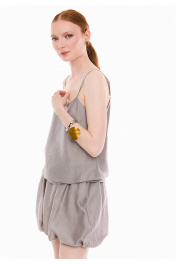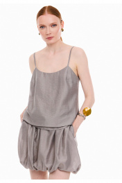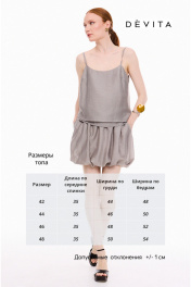 Блузка-топ из легкой, полупрозрачной ткани, двойная, с выступающей нижней частью. Прямой силуэт. Перед с нагрудными выточками от бокового шва. Регулируемые бретели позволяют настроить длину по вашему желанию. Измерения готового изделия расположены в табличке с фотографиями.