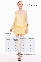 Блузка-топ из легкой, полупрозрачной ткани, двойная, с выступающей нижней частью. Прямой силуэт. Перед с нагрудными выточками от бокового шва. Регулируемые бретели позволяют настроить длину по вашему желанию. Измерения готового изделия расположены в табличке с фотографиями.
