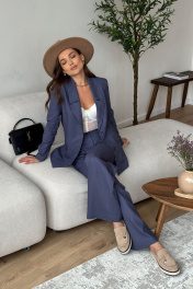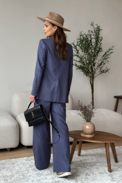 Костюм женский, состоящий из жакета и брюк. Жакет свободного силуэта длиной ниже линии бедер. Спинка со швом. Жакет с центрально-бортовой застежкой на 2 петли и пуговицы. Перед с нагрудными вытачками из бокового шва и наклонными рельефами, заканчивающимися на уровне кармана «в рамку». Ниже параллельно карману настрочен клапан. Воротник пиджачного типа с отложными лацканами. Рукава втачные двухшовные; по низу рукава обработана закрытая шлица с 4-мя пуговицами. Перед жакета на подкладке. Брюки - палаццо с застежкой на тесьму-молнию с гульфиком и откоском в среднем шве. Брюки на притачном поясе со шлевками и застежкой на одну прорезную петлю и пуговицу. Задняя часть пояса - на резинке. ЗП брюк с талиевыми вытачками. ПП брюк с двумя фиксированными складками и боковыми карманами. Длина жакета - 72,5 см - 73,7 см Длина рукава жакета - 62 см Длина брюк - 115,4 см