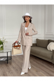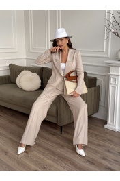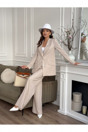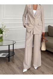 Костюм женский, состоящий из жакета и брюк. Жакет свободного силуэта длиной ниже линии бедер. Спинка со швом. Жакет с центрально-бортовой застежкой на 2 петли и пуговицы. Перед с нагрудными вытачками из бокового шва и наклонными рельефами, заканчивающимися на уровне кармана «в рамку». Ниже параллельно карману настрочен клапан. Воротник пиджачного типа с отложными лацканами. Рукава втачные двухшовные; по низу рукава обработана закрытая шлица с 4-мя пуговицами. Перед жакета на подкладке. Брюки - палаццо с застежкой на тесьму-молнию с гульфиком и откоском в среднем шве. Брюки на притачном поясе со шлевками и застежкой на одну прорезную петлю и пуговицу. Задняя часть пояса - на резинке. ЗП брюк с талиевыми вытачками. ПП брюк с двумя фиксированными складками и боковыми карманами. Длина жакета - 72,5 см - 73,7 см Длина рукава жакета - 62 см Длина брюк - 115,4 см